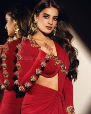 The RajaSaab Actress Nidhhi Agerwal in a Red Long Sleeved Golden Floral Top with a Red Draped Skirt Photos 02