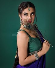 Popular Sexy Beauty Nidhhi Agerwal in a Royal Blue Saree with Golden Floral Embroidered Border and a Green Sleeveless Blouse Pictures 02
