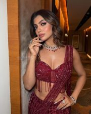 Sexy Bhojpuri Actress Akanksha Puri in a Shimmering Burgundy and Red Sequin Saree with a Sheer Corset Blouse Photos 03