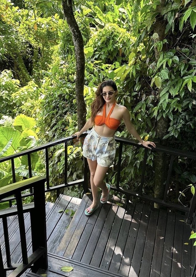 You are viewing a picture of Sexy Amyra Dastur in an Orange Bikini Holiday Photos 02 in KollywoodZone.com Photo Gallery.