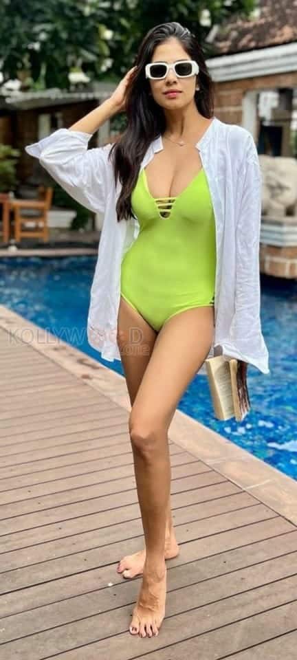 You are viewing a picture of Sexy Malavika Mohanan in a Neon Green Swimsuit Photos 01 in KollywoodZone.com Photo Gallery.