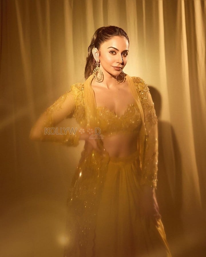 You are viewing a picture of Stunning Rakul Preet Singh in a Yellow Long Jacket With Dhoti Skirt Set Photos 02 in KollywoodZone.com Photo Gallery.