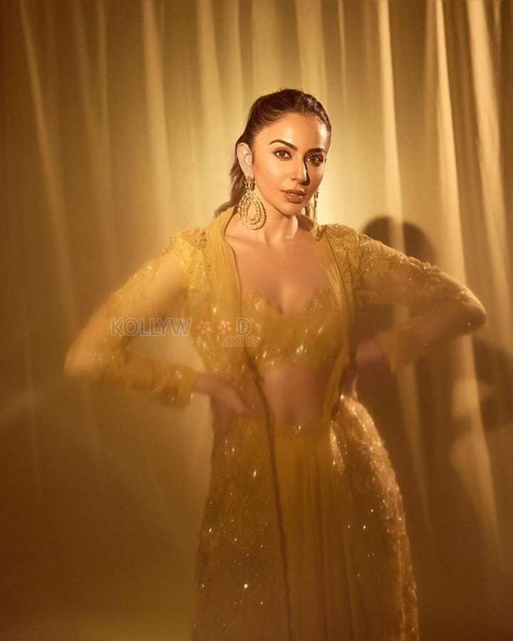 You are viewing a picture of Stunning Rakul Preet Singh in a Yellow Long Jacket With Dhoti Skirt Set Photos 03 in KollywoodZone.com Photo Gallery.