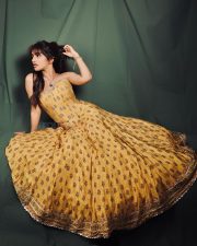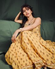 Stylish Heroine Sreeleela in an Mustard Yellow Printed Strapless Corset Top with a Midi Length Skirt Photos 06