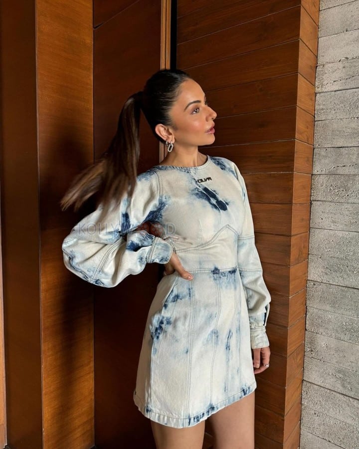 You are viewing an image of Stylish Actress Rakul Preet Singh in a Blue Denim Mini Dress Pictures 02 in KollywoodZone.com Photo Gallery