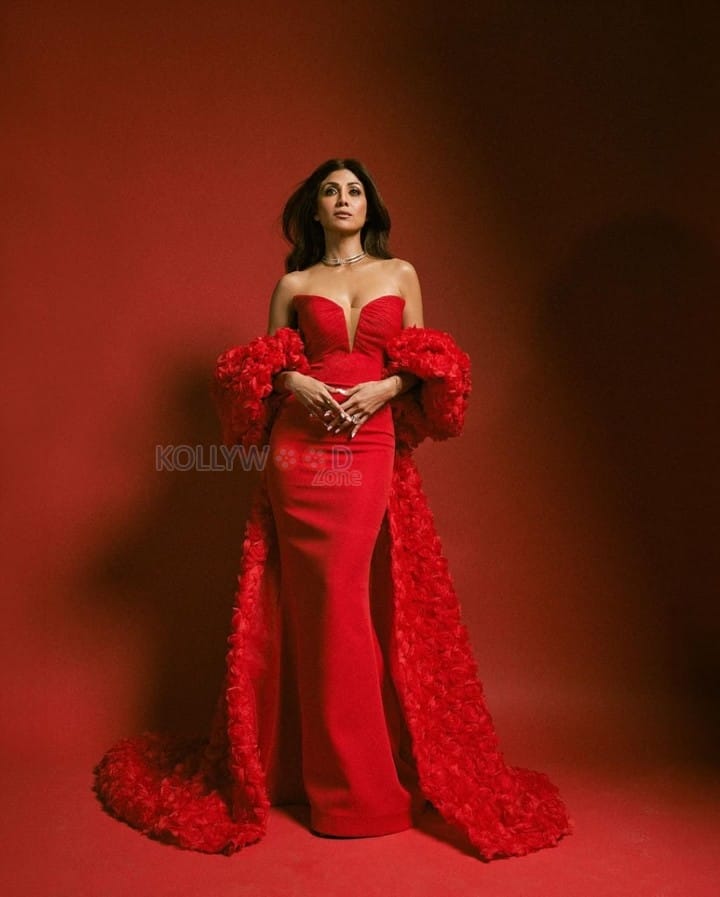 You are viewing a picture of Stylish Diva Shilpa Shetty in a Red Rose Off Shoulder Gown Photos 03 in KollywoodZone.com Photo Gallery.