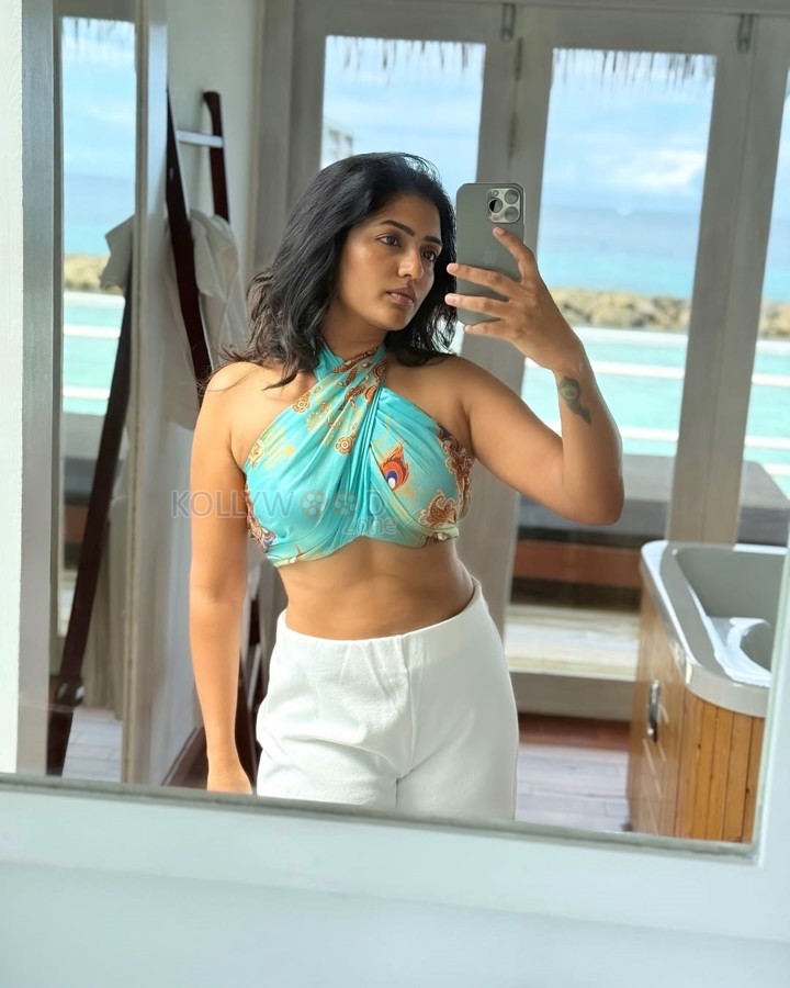 You are viewing a picture of Stylish Eesha Rebba in a Teal Top with a White Pant Photos 04 in KollywoodZone.com Photo Gallery.