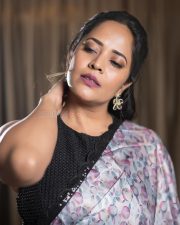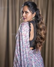 Tollywood Actress Anasuya Bharadwaj in a Muave and Silver Dual Tone Floral Butti Embroidery Saree with a Deep Wine Colored Velvet Blouse Pictures 03