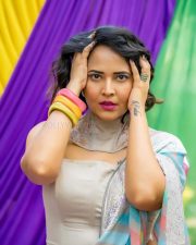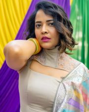 Ding Dong Actress Anasuya Bharadwaj in a Rainbow Striped Saree with a High Halter Neck Blouse Photos 02