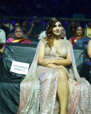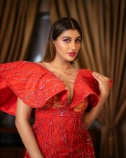 Tamil Glamour Actress Yashika Aannand in a Embellished Gold Bralette Top with a Multi Colored Thigh Slit Skirt Photos 03